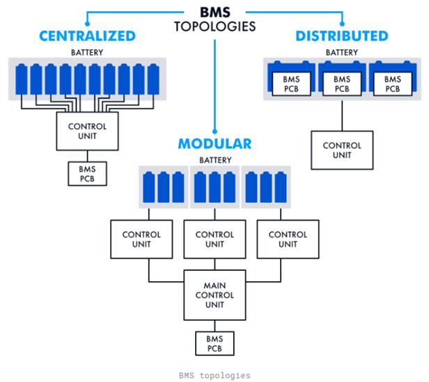 電化學(xué)儲(chǔ)能系統(tǒng)主要由電池組、電池管理系統(tǒng)(BMS)、能量管理系統(tǒng)(EMS)、儲(chǔ)能逆變器(PCS)以及其他電氣設(shè)備構(gòu)成。BMS是其中的核心組件之一,主要用于智能化管理及維護(hù)各電池單元,實(shí)時(shí)監(jiān)測(cè)電池SOC、SOH 等運(yùn)行狀態(tài),防止電池本體或系統(tǒng)出現(xiàn)安全風(fēng)險(xiǎn),助力儲(chǔ)能電池的安全、高效使用。 儲(chǔ)能系統(tǒng)中的電池管理系統(tǒng)(BMS)是保證儲(chǔ)能系統(tǒng)安全和性能穩(wěn)定的重要組成部分?,F(xiàn)在市場(chǎng)上主要存在三種類型的BMS技術(shù),包括分布式BMS、集中式BMS和模塊化BMS。